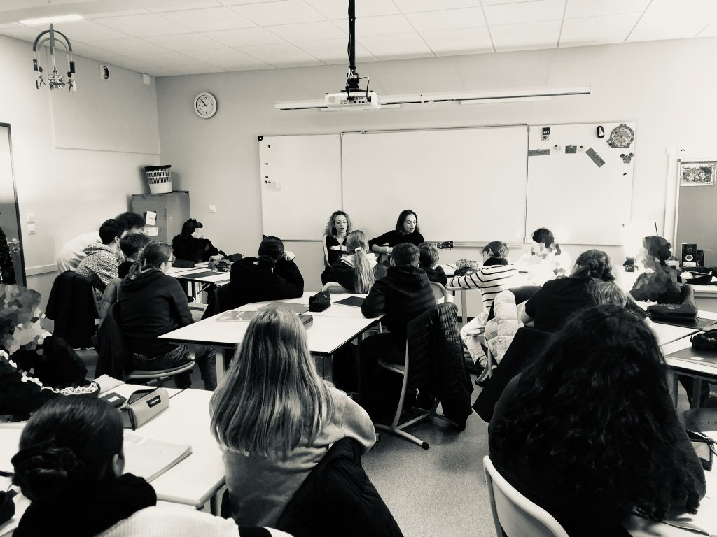 Les deux musiciennes sont intervenues dans une classe de première Arts Plastiques du professeur Vincent Mazet pour lancer avec les élèves la réalisation de visuels autour du morceau : affiches, tableaux, pins, stickers… les élèves ont travaillé sur les supports qu’ils souhaitaient pour mettre en image le morceau, la thématique, selon leur sensibilité.