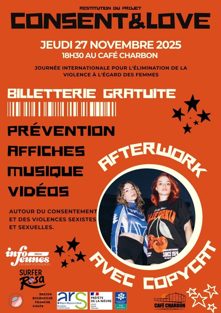 Consent & Love est un projet que nous avons mené sur l’année 2025 en collaboration avec plusieurs partenaires : le Bureau Information Jeunesse de la Nièvre, les deux musiciennes du duo Neversois Copycat, le collège Paul Langevin de Fourchambault, le lycée Alain Colas de Nevers, et la Mission Locale de Nevers.